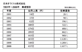 1998年5月決算で売上高466億円、経常利益109億円、純利益56億円に上っていた日本オラクルは、1999年2月に店頭登録企業として株式を公開。さらに翌1999年決算で売上高650億円、経常利益155億円、当期利益79億円を実現し、2000年4月には東京証券取引所1部に上場を果たした。これ以後、日本オラクルは爆発的な人気銘柄として高値を続け、2000年終盤になって株価も落ち着いたものの、典型的な“IT関連投資株”の代表的存在としてマーケットでも認知された。