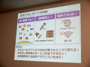 「おもてなしガイド」は、音波で通信するというヤマハの独自技術を用いて、ユーザーのスマートフォンに日本語音声の翻訳・文字情報をリアルタイムに提供できるシステム。店内アナウンス、博物館などの作品紹介ナレーション、乗り物の車内アナウンスなどを多言語化して配信するのに適しており、ユーザーはスマートフォンを音声にかざすだけで、翻訳情報を受けることができる仕組みだ。また、耳の聞こえにくい高齢者や聴覚障がい者の方に向けてソリューションとしても活用できる。そして、インターネット環境がなくとも、独自の音響通信技術によって、既存のスピーカー設備から情報を配信することができるため、災害にも強い新しいシステムとしても期待が寄せられる。