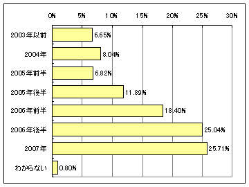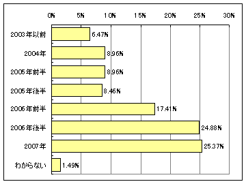 まず32インチ以上の薄型大画面テレビの普及度だが、Watch読者では25%強がすでに所有、56%が所有していないが購入したいという結果になり、gooリサーチでは約18%が所有、約62%が所有していないが購入したいと答えている。購入時期は、最近になるほど増えてきており、Watch読者・gooリサーチともに今年購入した人がもっとも多かった。