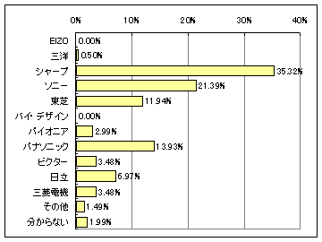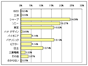 一方、三番手の位置がおびやかされているのが松下だ。「VIERA」ブランドの認知度は広告などで高くなってきているが、東芝が背後まで迫ってきている。東芝の「REGZA」はブランド名としては浸透度が高くないものの、メーカー名での指名買いが多い。とくに画質の傾向やゲームモードなどがマニア層の人気を集め、Watch読者では松下とほぼ変わらないシェアを占めている。そのほか「Wooo」の知名度が上がってきた日立までが「五強」で、今後も熾烈な戦いが繰り広げられていくと思われる。