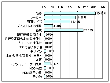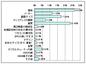 これから薄型大画面テレビを買おうとしている回答者が望む価格帯は、20万円未満が40%前後、20万円以上30万円未満が30%台だった。各メーカーとも消耗戦ともいえる価格下落で苦労しているが、消費者は「まだ下がるだろう」と待ちの姿勢である。しかし、最近新聞でテレビの販売価格の下げ止まりが報道され、今後の競争は価格だけではなく、ほかの要素に移っていくと思われる。