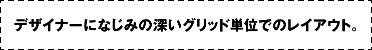 | Adobe Golive 4.0には、ページレイアウトなどの世界ではなじみの深い、グリッドによるレイアウトコントロールが採用されている。これは、画面のマス目を使ってブジェクトを配置できるというものだ。配置したオブジェクトは、グリッドに自動的に吸着させたり、グリッドのセンターなどに配置したりすることもできので、より正確で緻密がデザインが可能になる。従来のWebデザインソフトでは相当なスキルが要求された作業も、Adobe Golive 4.0ではマウス一つで済んでしまうのだ。それはあたかも、DTPソフトを使うイメージだ。 | |||||||