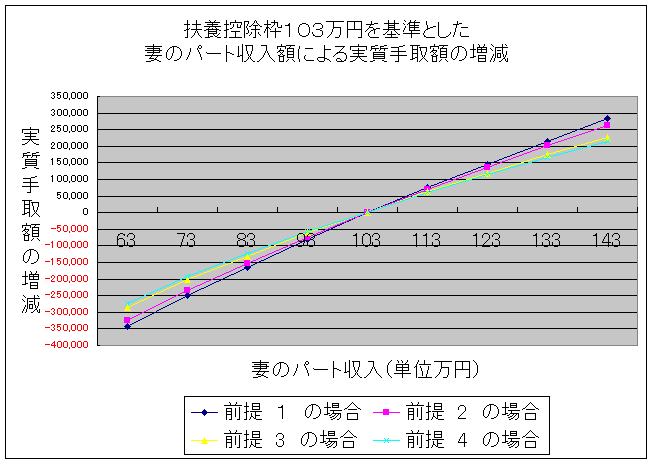 夫の課税総所得金額(税率を乗ずる前の金額)を下記の前提金額とし、妻のパート収入を所得税課税最低限の上限である103万円から増減させ実質手取額をあらわす。なお、所得税及び住民税の所得控除の差額並びに住民税均等割、定率減税は考慮しないものとする。
