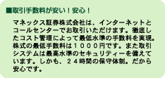 (1)手数料 株式売買手数料は1,000円から、口座管理料は2000年9月までは無料です。またご利用状況に応じてマネックスポイントを貯めることができ、手数料の割引などに使うことができます。
