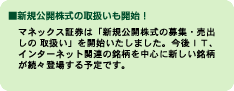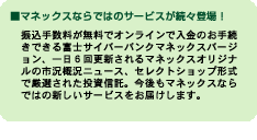 (2)情報 マネックス独自の情報をマネックスメールやホームページで配信します。リアルタイムの株価情報、チャート(日足、週足、月足)、投信情報などもご覧頂くことができます。さらに、J.P モルガンのリサーチ・ペーパーなどもご覧になれます。