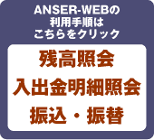 [ANSER-WEBを利用するためには] [振込・振替はもちろん、家計簿ソフトとの連動で、毎日のお金の出入りを簡単にチェックできる] [株価照会や証券取引をインターネットでオーダー!] [もうすぐ便利な新サービスも始まる!] |