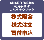 [ANSER-WEBを利用するためには] [振込・振替はもちろん、家計簿ソフトとの連動で、毎日のお金の出入りを簡単にチェックできる] [株価照会や証券取引をインターネットでオーダー!] [もうすぐ便利な新サービスも始まる!] |