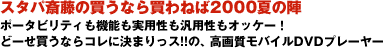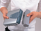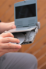 | MED300ASの良さのひとつとして、モバイルなDVDプレーヤーとして実用的なこと。前述のように、搭載された液晶ディスプレイは屋外光下でも見やすいし、バッグにスッポリ収まるコンパクトさがある。いくつかのオプションを使用すれば、非常に快適な"モバイルシアター"として活用できる。例えば、専用バッテリーパックMEDB01AXとワイヤードリモコンMEDH01AXと組み合わせて使うのだ。 バッテリーパックは本体の後方に装着できるスリムなもので、サイズ的には常時装着しておいてもさほど気にならない程度。充電時間は約3.5時間で、充電後の使用時間約2.5時間。フツーの映画のディスクならラクラク1枚鑑賞できる容量がある。ワイヤードリモコンは、単体ではコード付きのリモコンとして使えるのだが、リモコン部にヘッドホン端子が付いている。なので、この端子に一般的なポータブルステレオ用ヘッドホン等をつなげれば、リモコン付きヘッドホンの感覚でMED300ASを操作できるようになるのだ。 このふたつの機器を使えば、MED300ASはいつでもどこでも快適にDVDビデオを鑑賞できるモバイルシアターになる。新幹線や飛行機での移動中、キレイな画面と迫力のあるサウンドで、ひとり集中してお気に入りの映画なんかを観る。今まで退屈だった時間を楽しく有効利用できそうな気がしてならない。 というわけで、結論として、MED300ASは、かな~りヒキの強い製品だと感じる。室内でも屋外でもその高性能ぶりを発揮する。理屈の上では使いやすいハズって製品は多いものの、ここまで実用的に洗練されている製品はほとんどないのではないだろうか!? というわけで、俺の物欲はもうすぐ爆発しそうだ。