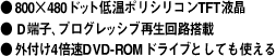 | MED300ASを使ってみて、まず驚くのが内蔵液晶ディスプレイの鮮明さだ。色合い、コントラスト、精細度、どの側面から見ても"高品位"。テレビ等に比べたら画面は小さいが、こと映像の美しさで言えばMED300ASの液晶の映像の方がずっとキレイだ感じる。結論から言って、ヘタなテレビに接続してDVDを鑑賞する時よりも遙かに美しい映像を堪能できる。つーか正直な話、ココまで映るんならMED300AS本体だけでDVDビデオを"じっくり"楽しむことができますな。 ところで、MED300ASに採用されているこの美麗な液晶ディスプレイは、モノとしては低温ポリシリコンTFT液晶だ。モバイルガジェット向けとして定評のある低温ポリシリコンTFT液晶だが、そのメリットは、従来品よりも明るくて画素の密度の高いディスプレイを作れるという点。ぶっちゃけた話、明るい場所だろうが暗い場所だろうが非常に鮮明に映像を観られ、しかも緻密な映像の表示が可能になるという点だ。室内でも屋外でもクッキリきれいで滑らかな映像を楽しみたい!! という向きにはまさにうってつけの液晶パネルなのである。 実際、MED300ASは薄暗い室内でも、まばゆい太陽光がある屋外でも、十分実用レベルの美しい映像を鑑賞できる。これまでの液晶ディスプレイだと、屋外使用時、日陰とかじゃないとかなり観にくい(もしくはほとんど見えない)という感じだったのだが、この液晶なら問題ナシだ。また、小型の液晶で映画を観ると、細部が観にくかったり不鮮明だったりしがちだったが、その点においてもMED300ASの液晶は問題ナシ。液晶面に顔を近づけて映像の細部を観ても、十分キレイに感じられるという密度の高さ。ホントに良くできたディスプレイだ。 |