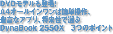 DynaBook2550Xは、CPUにCeleron366MHz、メモリ64MB、HDD8.1GBを搭載したA4タイプのオールインワンノートPC。これからのメディアとして注目される2.4倍速DVD-ROMモデルが用意されている。しかも、2種類のDVD映画タイトルが添付されるので、XGA対応の14.1型大画面TFT液晶、低音を強化した高音質ステレオスピーカーと組み合わせて、DVDビデオを大迫力で楽しむことができるわけだ。また、操作性を大きく左右するキーボードは、キーピッチがフルサイズ19mm、ストロークも3mmを確保、アキュポイントとともにデスクトップ同様の操作感を実現する。 |