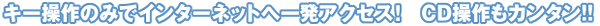 現在、ノートPCの使用法としてもっとも多いのはインターネットへの接続だろう。ネットサーフィンやインターネットメールなど、インターネットはPCの利用法を大きく変えた。ただ、インターネットへ接続する際にはブラウザの起動など各種操作が必要になるが、DynaBook2550Xの場合、キー操作の組み合わせで簡単にインターネットブラウザを起動することが可能。もちろん、V.90対応56kモデムを内蔵しているから、買ったらすぐに簡単操作で高速インターネットを楽しめるわけだ。そのほかにも、キー操作で音楽CDのコントロールも可能だ。 |