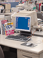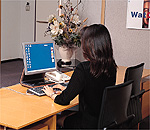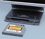 DynaTopはスペックも凄い。個人向けの6000は、CPUにCeleron433MHz、メモリ64MB、HDD8.1GBと、デスクトップ並みのハイパフォーマンスを誇る。さらに、通常のデスクトップでは見られないPCカードスロット(TYPEII×2またはTYPEIII×1)、赤外線通信ポートが搭載され、ノートPC世界NO.1シェアの東芝らしい仕様となっている。また、本体下部のホットスワップ対応セレクタブルベイには標準でDVD-ROMドライブを装備。このドライブはDVDビデオの再生も可能なので、200cd/㎡という高輝度の15型TFTカラー液晶でとても美しい映画を楽しむことができるわけだ。 |