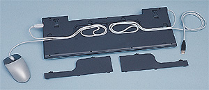 液晶一体型PC、DynaTopは美しさを追求したマシンだ。本体が収まっていることを忘れてしまいそうなスリムなデザインだけでなく、これまでのデスクトップではどうしても解決しなかった各種ケーブル類に関しても工夫がなされている。インターフェースが1カ所にまとめられたうえ、スパイラルチューブによって一体化できるし、カバーで接続部を覆い隠すことが可能。さらにキーボード背面のケーブルケースには、キーボードやマウスの余ったケーブルを収納できるという徹底ぶりだ。これなら企業の受付に設置しても、来客に丸見えのケーブル類をさらすことはない。 |