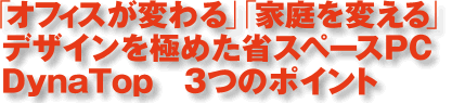 ![]() デスクトップPCとノートPCのそれぞれの良さを併せ持つ新ジャンル-スリムPC、それがDynaTop6000だ。つまり、DynaTopは、デスクトップPCの画面の大きさ、キーボードの操作性、高性能といった特徴と、ノートPCのもつ省スペース性、スリムなデザイン、配線が不要、持ち運びが容易などのメリットを融合して作り上げられた製品なわけだ。しかも、見られることを意識したデザインで、ユーザーサイドばかりでなく、背面から見た際のデザインにまで考慮されている。スペックもデスクトップ並みのハイパフォーマンスを誇り、家庭用にDynaTop6000、オフィス用にDynaTop2000シリーズが用意されている。 |