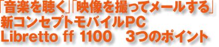 DynaBook10周年記念モデルとして発売された4製品の中で、もっとも注目されているのが「Libretto ff 1100」だ。音楽の再生停止などをコントロールする専用リモコン「i.Shuttle」、脱着可能なCOMSカメラ「SCOOPY」、デジタルカメラとの親和性を高めた「スマートメディアドライブ搭載」など、これまで以上に日常生活に密着した新機能が詰め込まれ、Libretto ff 1100はモバイルエンターテイメントPCへと進化を遂げた。常に持ち歩き、音楽を楽しみ、ムービーを撮影する。もちろん、Windowsマシンとしてメールやインターネット接続にも使う。PCの新しい形を提案する、それがLibretto ffなのだ。 |