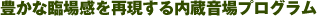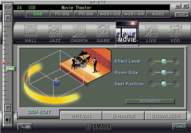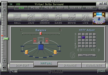 先進のオーディオ・システムとして、さまざまな機能を装備するAP-U70/DP-U50だが、なんといっても最大の特長は、サラウンド・サウンドを二つのスピーカーでバーチャルに実現することだろう。現在、DTSやドルビー・デジタルによる5.1chのサラウンド・サウンドに対応したDVD-Video作品が数多く登場している。これらをPCで鑑賞する際、二つのスピーカー、もしくは重低音を出すサブウーファーを加えた三つのスピーカーだけで、立体的な音響をシミュレートしてくれるのだ。 実際に、これらのDVD-Video作品をPCで再生させ、AP-U70を通じて前面に配置された左右のスピーカーから音を出してみると、なんと後ろからも音が聞こえてくる。背後から忍び寄る足音、真横からの銃声、そしてもちろん正面からの話し声など、まさに劇場的と言えるリアルな音響空間が体感できるのだ。従来のRP-U100でもドルビー・デジタルおよびドルビー・プロロジックでは、同様の機能を実現していたが、このAP-U70/DP-U50では新たにDTSにも対応。より高品位なデジタル・サラウンド環境が得られるようになっている。 さらに、ヤマハ独自の「シネマDSP」というサラウンド技術を、2本のスピーカーで実現する「ニアフィールド・シネマDSP」機能を搭載。通常のステレオでもHALL、CHURCH、JAZZなどの音場が楽しめるほか、GAME、MOVIE、VIRTUAL SURROUND……といったDVD再生時に威力を発揮するプログラムも用意されている。また、「サイレントシアター」という機能により、ヘッドホンでサラウンド環境の再現ができる点も見逃せないポイントだろう。バーチャルリアスピーカーの位置調整や、DSPのモード、音質・音量調整は、PC側から設定できるのはもちろん、添付のワイヤレスリモコンでも操作可能。使いやすさにも気を配った設計になっている。 |