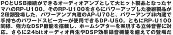 DIF経由でのみ行なえる)。これなら誰でも手軽に利用できるし、PC側に特別な装置を取り付ける必要もない。 このUSB経由で通るサウンドは通常のステレオ2chと、DTS、ドルビー・デジタルなどの5.1chに加え、4chのサウンドにも対応。DirectSound3Dに対応したゲームタイトルなら、4chのサラウンドで再生できる。さらに、ここで利用できるサウンドフォーマットも多彩になっており、一般的な44.1kHz/16bitのサウンドだけでなく、最高で48kHz/24bitというハイクオリティのサウンドにも対応している。まだ24bitに対応した作品は少ないのが現状だが、このスペックがあれば次世代オーディオ作品にも十分に対応できるだろう。 また、AP-U70/DP-U50で注目したいのが、USBに限らず入出力端子を数多く装備し、さまざまな外部機器との組み合わせが可能になっている点だ。アナログ入力としてPC、AUX1、AUX2の3系統。また、デジタル入力も光角×2、同軸×1が装備されている。さらに出力のほうは、アナログのRECアウトおよび光角端子が1系統装備されているといった具合だ。ちなみに、AP-U70とDP-U50の違いは、アナログ出力にスピーカーアウトがあるか否か。内部に20W+20Wのアンプを内蔵して直接スピーカーに接続できるのがAP-U70で、外部のアンプに接続するかアンプ内蔵スピーカーに接続するのがDP-U50となっている。 そして、非常にユニークなのが、前述のバーチャル・サラウンドの処理を施したサウンドをアナログおよびデジタル出力端子を通じて外部のMDレコーダーなどへ録音できるという点。DSP効果を施したサウンドをMDなどに録音すれば、AP-U70/DP-U50のない環境でも同様のバーチャル・サラウンド・サウンドが楽しめる。また、外部接続のオーディオ機器だけでなく、AP-U70/DP-U50でDSP効果をかけたサウンドを再度USB経由でPCへ取り込むことも可能。もちろん、これらの処理を施さずに、外部のデジタルオーディオ機器からデジタルデータを音質劣化なしにPCへ取り込むこともできる。 先進のサウンド機能と柔軟性を兼ね備えるマルチメディア・アンプAP-U70、そしてマルチメディア・サウンド・プロセッサDP-U50。これらがあれば、PCを高品質かつ立体的なサウンドを創り出す、ハイエンドAVマシンへと変身させることが可能だ。
