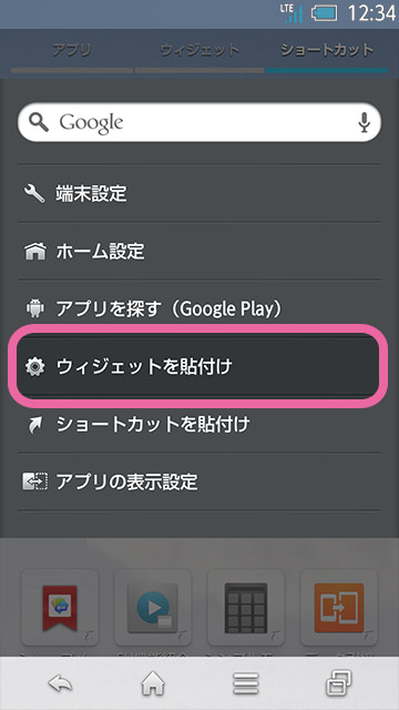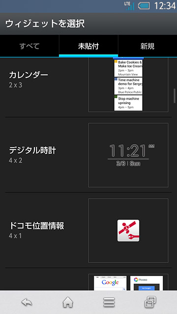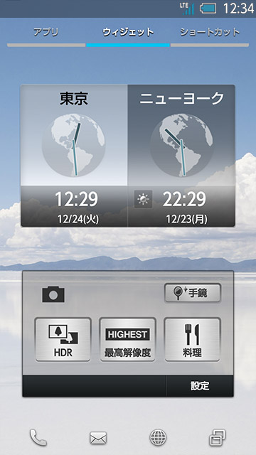 お隣の「ウィジェット」シートはその名の通り、ウィジェットを貼り付けておくところ。ウィジェットは本来、Androidプラットフォームももっとも面白いところなんだけど、他機種でも今ひとつ活用されていないというか、活用しにくい印象が強い。そこで、3ラインホームではウィジェットを貼り付けるためのシートを用意して、このシートを見れば、さまざまな最新情報を確認できるようにしている。使い方は人それぞれだけど、何も表示されていないところをロングタッチするか、画面を下方向にドラッグして「ウィジェットを貼付け」をタップして、セットしたウィジェットを選ぶ。基本的なところでは、「時計・インフォメーション」「天気」などがあるけど、海外旅行に出かける人は「世界時計」をセットしておくと、日本時間と現地時間の違いがすぐにわかるし、「歩数計」も旅先にはおすすめのウィジェットだ。「SHカメラ」のウィジェットも「HDR」や撮影モードの「料理」など、使いたいカメラの機能を有効にして、カメラを起動できるので便利だ。