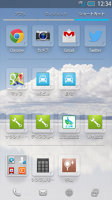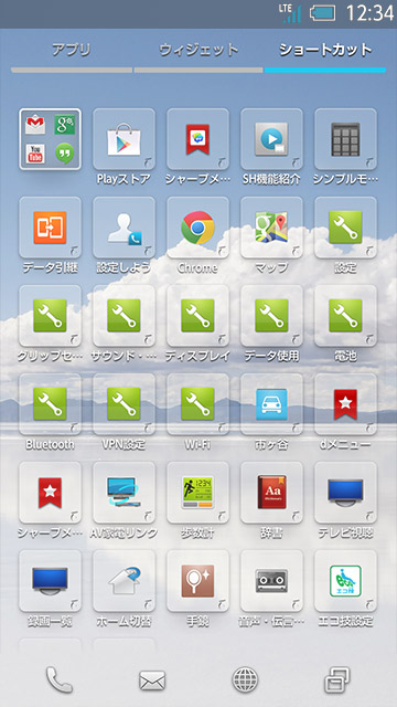次に、ロックを解除したときに表示されるのが「3ラインホーム」と呼ばれるホーム画面。「アプリ」「ウィジェット」「ショートカット」という3つの縦スクロールのシートで構成されていて、画面上段のタブをタップしたり、左右にフリックすることで、それぞれのシートを切り替えることができる。「アプリ」シートはAQUOS PHONEにインストールされているアプリが並んでいて、上下にスクロールさせて、使いたいアプリをタップして、起動する。追加でインストールしたアプリのアイコンは、最下段に登録されるけど、ロングタッチして、ドラッグすれば、他の位置に移動できるうえ、他のアプリのアイコンと重ね合わせれば、フォルダを作ることもできる。また、上段の「アプリ」タブをタップすれば、画面最上段と最下段をすぐに切り替えることができる。