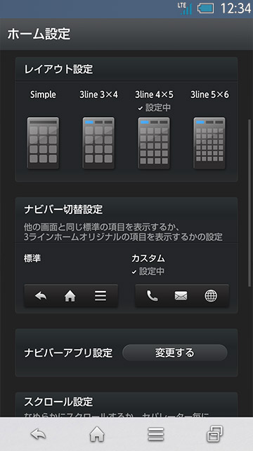 この3つのシートの役割を理解すると、グッとわかりやすくなる3ラインホームだけど、自分の好みに合わせて、使いやすくすることも可能だ。まず、メニューキーをタップするか、各シートで下方向にドラッグしたときに表示されるメニュー画面から[ホーム設定]を選ぶと、3ラインホームの設定画面が表示される。各項目の内容は説明もあるので、わかるだろうけど、個人的に試してみて欲しいのが「レイアウト設定」と「ナビバー切替設定」。レイアウト設定は標準的な「3line 3×4」「3line 4×5」のほかに、初心者にやさしい「Simple」、フルHDの高解像度を活かした「3line 5×6」を選ぶことができる。