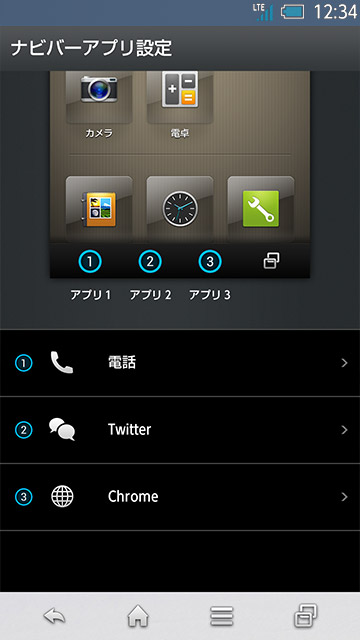 画面下段に表示されるナビバーは、左から順に[戻る][ホーム][メニュー][アプリ使用履歴]の順にアイコンが並んでいるけど、ナビバー切替設定で「カスタム」を選ぶと、他のアイコンを表示させることができる。初期値では[電話][メール][ブラウザ][アプリ使用履歴]だけど、同じ画面の「ナビバーアプリ設定」を選ぶと、他のアプリや機能を設定することもできる。