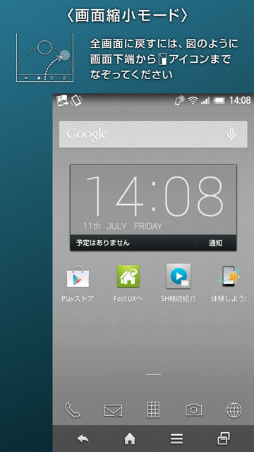 この画面縮小モードは、AQUOSシリーズに標準で設定されているFeel UXを利用しているときはもちろん、Android標準に近いシャープの「SHホーム」、AQUOS ZETA SH-04Fに用意されているNTTドコモの「docomo LIVE UX」や「docomoシンプルホーム」、AQUOS SERIE SHL25に用意されているauの「auベーシックホーム」でも同じように操作することができる。ホーム画面やアプリ一覧画面を表示しているときだけでなく、Webブラウザーやメーラーなど、さまざまなアプリを表示しているときも同じように操作すれば、画面を縮小表示できる。ちなみに、AQUOS PAD SH-06Fはタブレットということもあり、画面縮小モードは搭載されていない。