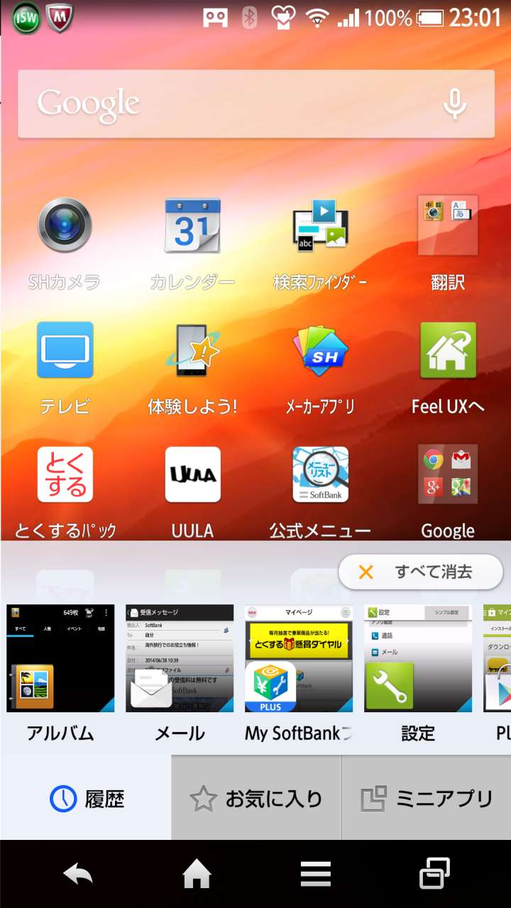 最初に表示される「履歴」には、最近使ったアプリが表示される。一覧は左右にスクロールでき、それまでに起動したアプリのサムネイルをタップすれば、すぐに切り替えることができ、下方向にフリックすれば、一覧から消去することができる。