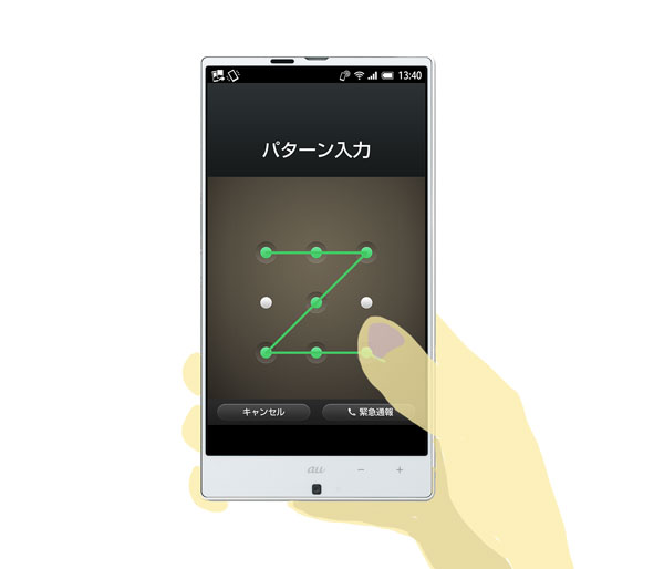 パターンを入力するとき、皮膚の油分などで指先でなぞった跡が画面に残るのは気をつけたいけど、もっと基本的なのがパターンをなぞったときに画面に表示される『軌跡』。パターンを入力するとき、出荷時設定では軌跡が表示されるため、パターン入力時の指の動きが見られていなくても入力直後の確認画面を見られてしまうと、パターンが周囲の人に見えてしまう可能性がある。