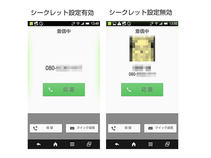 「シークレット設定」では、シークレット属性を設定した特定の連絡先からの着信を隠すことができる。普段はシークレットモードで利用しておき、一時的にシークレットモードを解除したいときは、画面最上段から下方向にフリックしてステータスパネルを表示し、右上のスパナのアイコンをロングタップすると、暗証番号の入力画面が表示されるので、暗証番号を入力する。再びシークレットモードに切り替えたいときは、一度画面オフにすればいい。