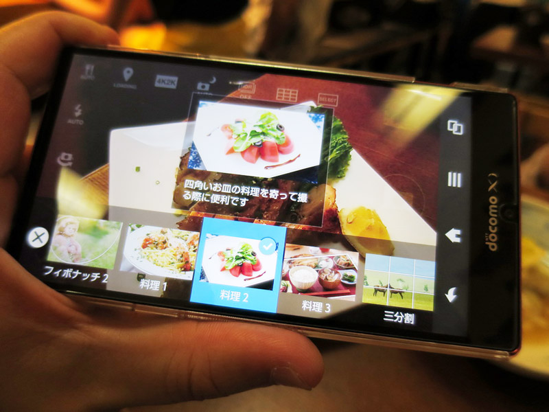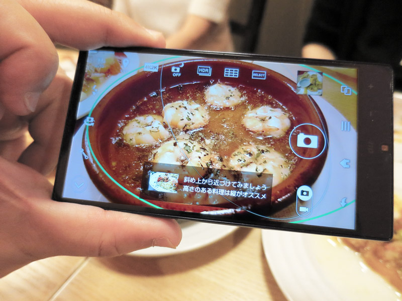 たとえば、料理であれば、丸いお皿のガイドが表示され、少し斜め上から撮るようにアドバイスされる。人物撮影なら、目線を合わせる横のライン、風景の撮影なら、撮りたいものにタッチすると表示されるラインに被写体を合わせる、といった具合いだ。それぞれのガイドはカメラを起動したとき、メニューキーをタップし、表示されたメニューから[フレーミングアドバイザーヘルプ]を選ぶと、確認することができる。