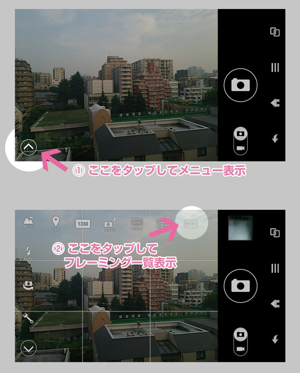 フレーミングアドバイザーはシーンを自動認識して最適なフレーミングを提案してくれるけど、自分でフレーミングを選択することもできる。カメラを起動した状態で、ファインダーの角に表示されている矢印形のアイコンをタップして、各機能のアイコンが表示された状態に切り替え、[SELECT]のアイコンをタップしてみよう。