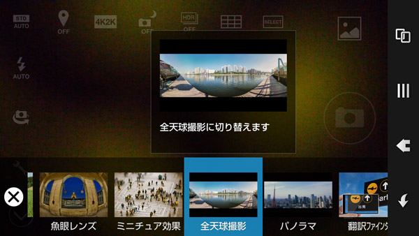撮り方はいたって簡単。[SHカメラ]のアプリを起動し、ファインダーの角に表示されている矢印形のアイコンをタップして、各機能のアイコンが表示された状態に切り替える。続いて、もう片方の角に表示されている[撮影モード/カメラ設定]アイコンをタップし、表示された一覧から[全天球撮影]を選ぶ。