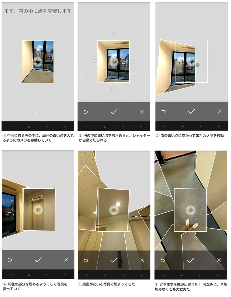 撮影が開始したら、まず全天球写真の起点となる方向にカメラを向け、[撮影]をタップする。起点となる場所で撮影すると、今度は上下左右の少しずれた位置に丸い点が表示されるので、そこにファインダー内の[○]アイコンを合わせる。自動的にシャッターが切られ、周囲の風景が少しずつつながって撮影されていく。これをくり返し、自分の周囲360度の写真を撮ると、最終的に撮り終わったら、画面下段のチェックマークをタップする。