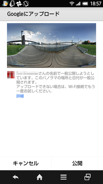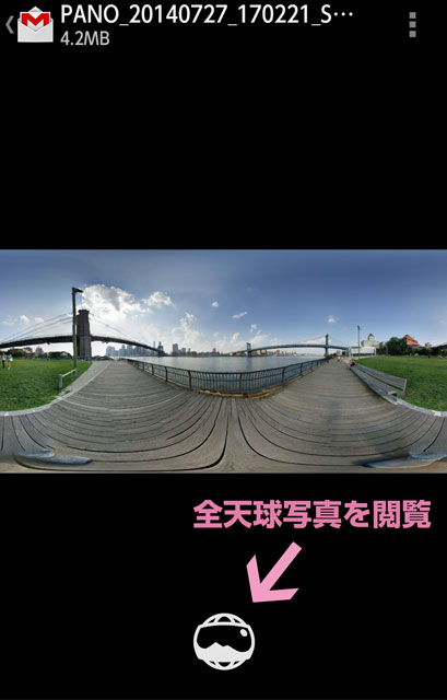 この全天球撮影で撮影した画像はJPEG形式なので、メールに添付して、そのまま送信することができる。相手がAndroid 4.2以降のスマートフォンやタブレットであれば、メールに添付された画像を端末に保存し、各機種の写真再生アプリから選べば、同じように全天球写真を楽しむことが可能だ。また、Google+に投稿したり、Google マップにアップロードして世界中に公開することもできる。