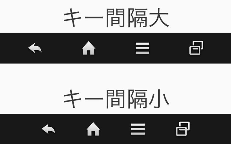 また、Androidスマートフォンには必ず用意されている[戻る][ホーム]などのキーが表示されるナビゲーションキーも片手操作用にカスタマイズできる。初期設定の場合、画面の最下段に少し間隔を開けて、それぞれのキーが表示されているんだけど、端末を右手で持って、片手操作をしようとすると、[戻る]キーが遠かったり、左手の片手持ちでは[アプリ履歴]キーが遠く、人によっては操作しにくいといったことが起きる。そこで、これらのキーの間隔を狭く表示することで、左右どちらの手で持ったときも片手でそれぞれのキーに指を届きやすくできる。