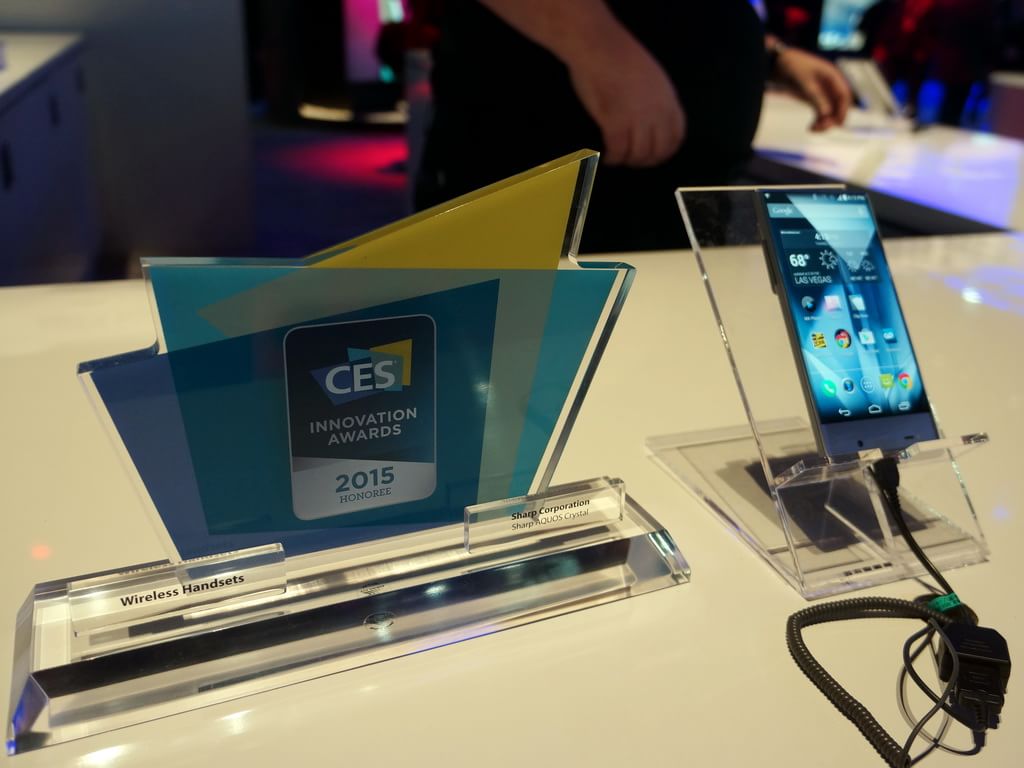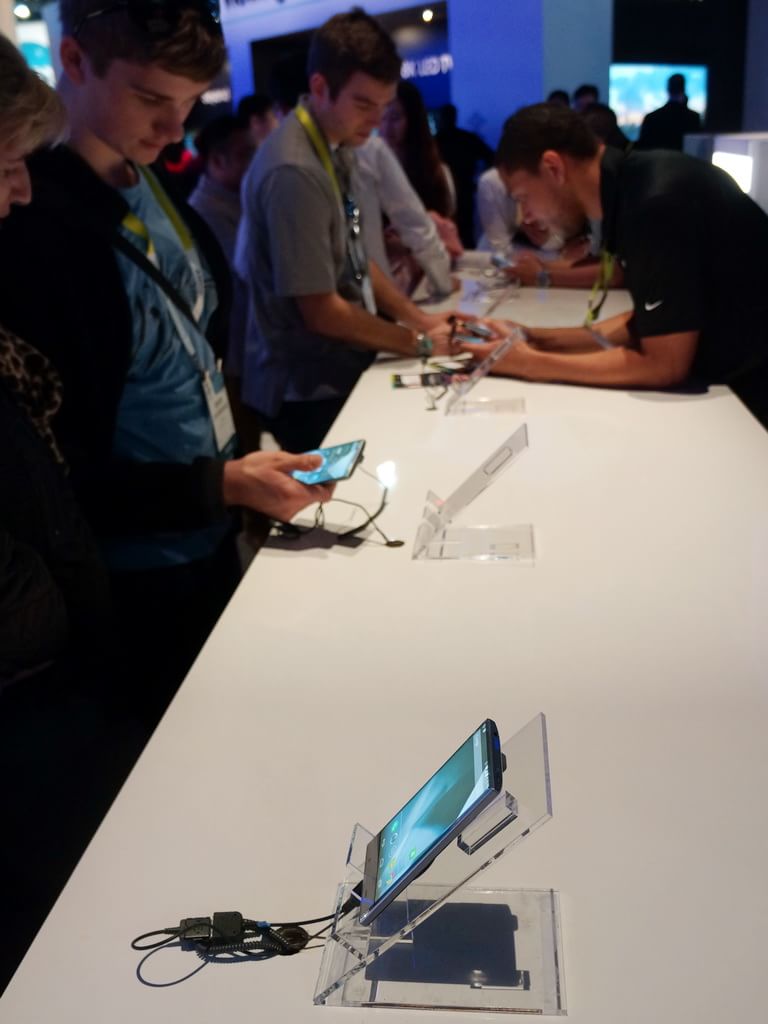 一方、2015 International CESのシャープブースでは、液晶テレビ「AQUOS」の新製品などと共に、AQUOS CRYSTALが出品されていた。タッチ&トライコーナーには実際に操作可能なAQUOS CRYSTALが並び、説明員のガイダンスを聞きながら、多くの来場者が興味深そうに本体を触っていた。やはり、フレームレス構造は他機種にないものであり、手に持ったときのインパクトはこちらの人にも共通するようで、自分が持っている機種と見比べながら、説明員の案内に聞き入っていた。