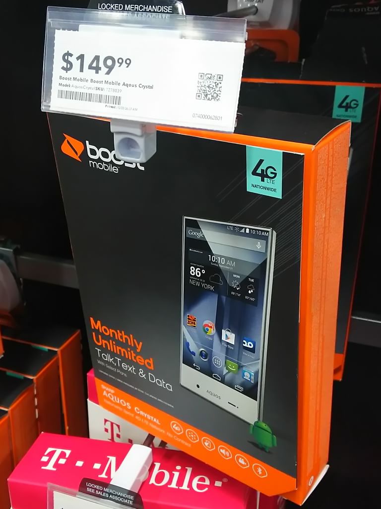 BEST BUYに出向き、早速、携帯電話&スマートフォンコーナーをチェックしてみると、黄色いパッケージが目立つSprint版、オレンジとグレーのパッケージのboost mobile版がそれぞれのコーナーのボードに提げられて、販売されていた。展示コーナーに飾られていたのはモックアップだったけど、画面サイズが大きいし、他機種と比べても存在感は圧倒的。
