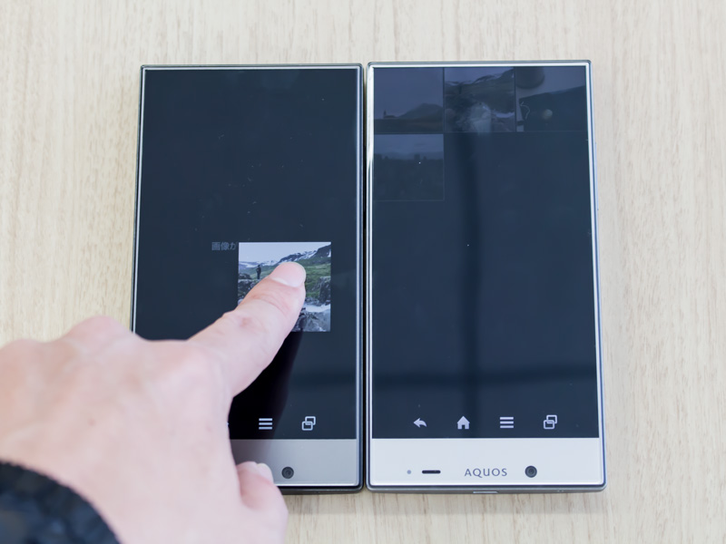 AQUOS CRYSTAL Xの画面には撮影した写真が表示されているので、コピーしたい画像を長押しして、そのままもう片方のAQUOS CRYSTAL Xの方へドラッグすると、2台のAQUOS CRYSTAL Xにまたがるようにして、画像が表示される。たとえば、端末を横向きにして撮影した横長の写真は、2台分の画面でワイドに表示されるので、いつもよりも大きく表示することが可能だ。ちなみに、2台の端末間で画像をドラッグするとき、端末が少し動いてしまうことがあるので、誰かに軽く端末の側面を押さえてもらうと、操作しやすい。