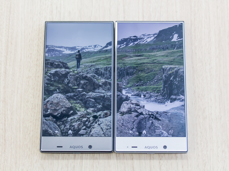 まるで液晶ディスプレイそのものを持ち歩いているようなAQUOS CRYSTAL Xのフレームレスデザイン。それを活かした機能をひとつ紹介しよう。街中や展示会などで、狭額縁のディスプレイをいくつもつなげて、ひとつの大きなスクリーンを構成するデジタルサイネージを見かけることがあるけど、あれに似たような見せ方を楽しむことができる「Swipe Pair」という機能だ。