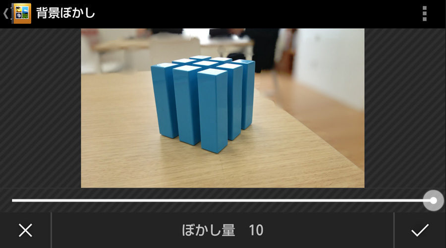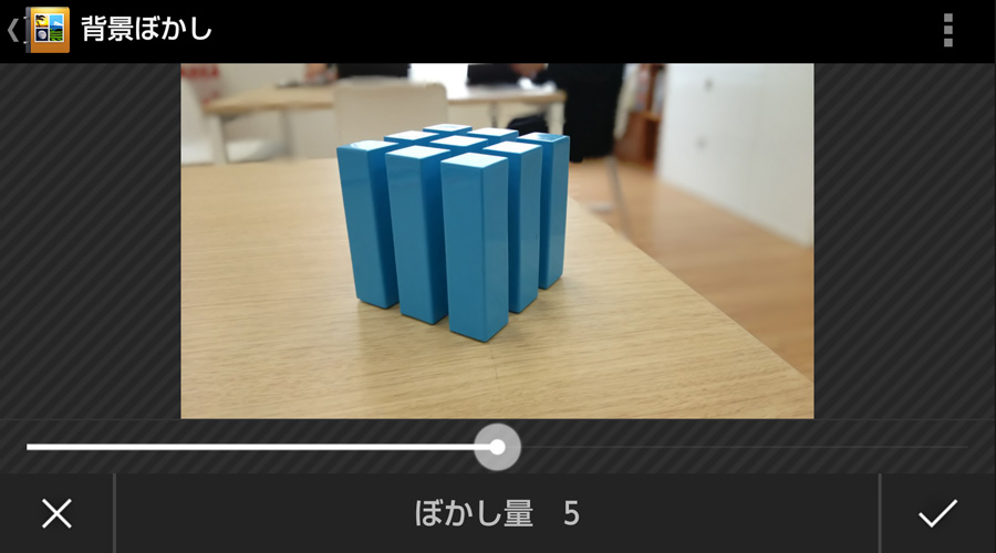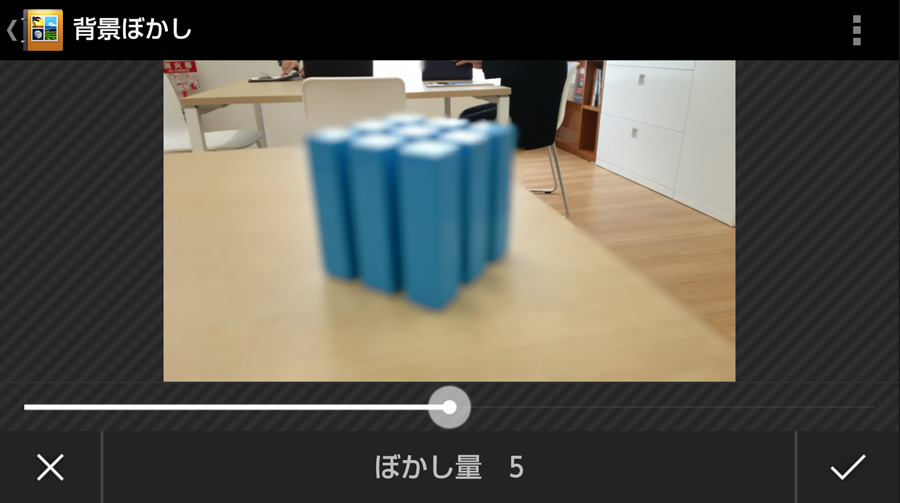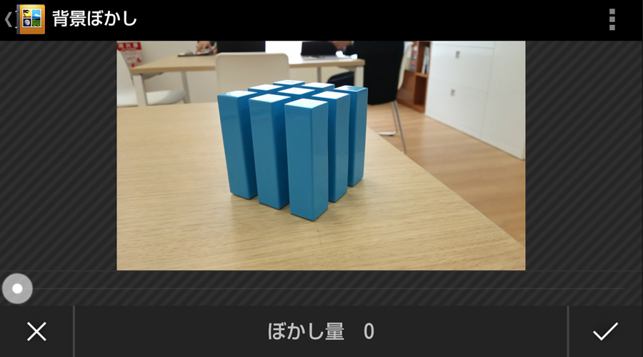 もうひとつの「背景ぼかし」。一眼レフなどで撮影した写真で、背景がぼけているのに、被写体がクッキリと写った写真をよく見かけるけど、これをスマートフォンのカメラで実現するのが「背景ぼかし」。撮影モードで「背景ぼかし」を選んで撮影すれば、撮影後のプレビュー表示で、どの位置をぼかすか、どれくらいぼかすかを変更することが可能だ。なかでも奥行のあるシーンで撮影するときは、ぼかす位置を変更して、写真の変化を楽しむことができる。アクセサリーやグラス、ケーキなどのスイーツ、花、小物など、ちょっと小さめの被写体を強調した写真を撮りたいときにもおすすめだ。