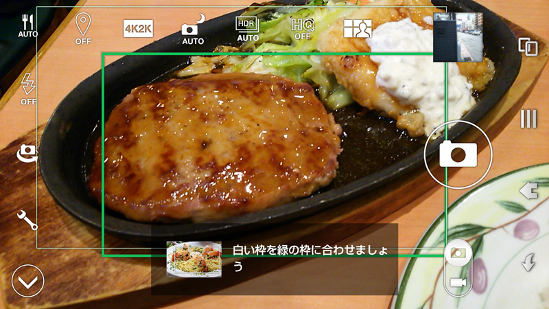 たとえば、昨年のAQUOSスマートフォンに搭載され、好評を得ている「フレーミングアドバイザー」は、人物や風景などの被写体を認識し、それぞれのシーンに合わせた構図(フレーミング)を画面上でアドバイスしてくれるというもの。以前にもAQUOS Watch+で紹介したけど、2014年冬春モデルでは料理の写真を撮るとき、しっかりと被写体に寄って、美味しそうな写真を撮影できるように進化している。