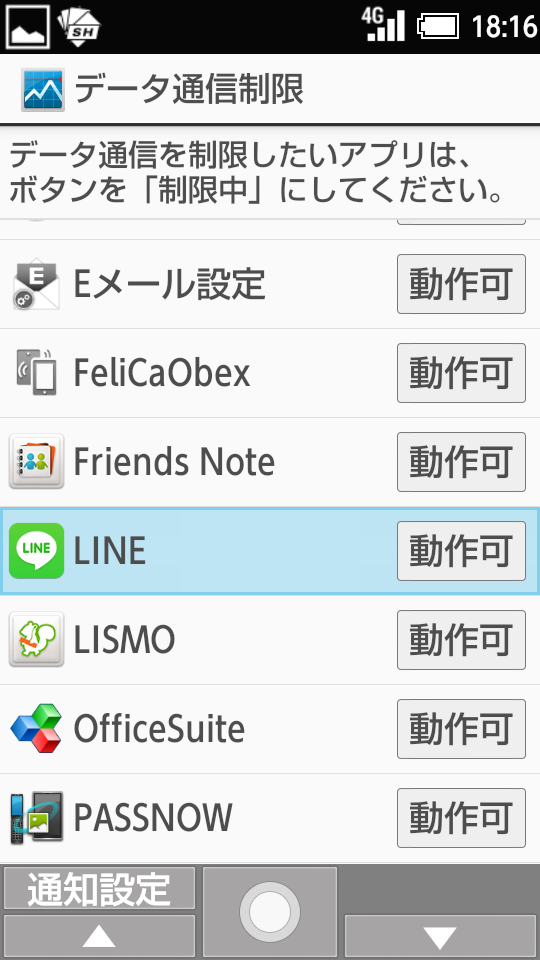 ところで、AQUOS Kでは、アプリ毎にモバイルデータ通信の制限を行うか否かを設定できる仕様となっている。LINEのアプリも同様の制限ができるが、それでは新着メッセージの通知が届かなくなってしまう。LINEの通信を許可したいときは、メインメニューから[設定]-[通信・ネットワーク]-[データ通信設定]-[データ通信制限]の順に選び、一覧に表示されているアプリで「LINE」を見つけ、センターキーを押して、[動作可]に切り替えれば、新着通知も受けられるようになる。