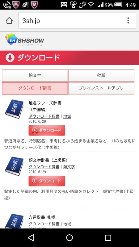 そして、最後にチェックしておきたいのが[辞書]。冒頭でも説明したように、S-Shoinは予測変換の候補が3倍に増えているため、かなり変換の効率が高められているけど、今後も継続的に使うことを考えれば、辞書のメインテナンスや追加が必要になってくる。[辞書]-[ダウンロード辞書]を選ぶと、メーカーサイト[SHSHOW]に接続されるので、そこで「地名フレーズ辞書」や「デジタル家電辞書」など、それぞれのジャンルに合った辞書をダウンロードして追加することができる。もちろん、無料で利用可能だ。さらに、[辞書]-[変換辞書の更新]を選ぶと、出荷時に搭載されている辞書が更新されるしくみになっており、必要に応じて、Playストアからダウンロードして、更新することが可能だ。