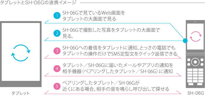 SH-06Gにかかってきた電話をSH-05Gに通知したり、あるいはSH-05Gに届いたアプリの通知をSH-06Gにも通知したり……といったことが可能
