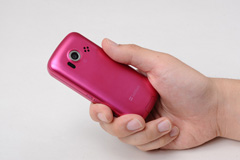 スライド式ボディを採用した101SHだが、手に取ってみると、ボディはコンパクトで持ちやすい形状に仕上げられている。一般的にスマートフォンはプレート状の幅広ボディを採用しているため、手の大きくない女性などにはちょっと持ちにくかったり、片手での操作がしにくい面があるが、101SHは幅が約53mm、高さが約112mmと、折りたたみやスライド式のケータイと変わらないボディサイズにまとめられている。しかもボディ背面が手にフィットするラウンド形状に仕上げられており、女性の手でも十分に片手で操作することが可能だ。