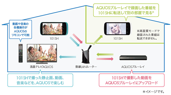 また、このWi-Fiを自宅などで利用すると、液晶テレビのAQUOSやAQUOSブルーレイと連携させる「スマートファミリンク」も便利な機能だ。たとえば、101SHで撮影した写真や動画をWi-Fi経由でAQUOSで楽しんだり、AQUOSブルーレイで録画した番組をWi-Fi経由で101SHで楽しむといった使い方ができる。特に、101SHは防水対応なので、AQUOSブルーレイで録りためた番組をお風呂でゆっくりと楽しむことも可能だ。Wi-Fi環境がないときは、AQUOSブルーレイとmicroUSBケーブルで接続して転送し、高画質のまま、番組を外出先で楽しむこともできる。ちなみに、帰宅して、ケータイをカバンなどに入れたままで着信に気づかなかったといったことはよくあるが、101SHにあった着信やメールの受信をAQUOSの画面に表示するといった設定も可能だ。