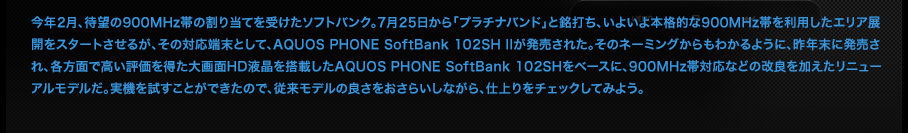 今回発売されたAQUOS PHONE SoftBank 102SHIIは、昨年末に発売され、各方面で高い評価を得たAQUOS PHONE SoftBank 102SHをベースに、900MHz帯に対応させたリニューアルモデルだ。モバイルデータ通信はソフトバンクが展開するULTRA SPEEDに対応し、受信時最大21Mbpsを実現する。プラチナバンドに対応することで、一段とそのパフォーマンスが活きてくることになるわけだ。