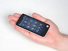 サイズも特長的だ。突起部を除いたサイズは、幅約58mm、高さ約115mm、厚さ約12mmで、重さは約116g。画面サイズは3.7インチ(854×480ドット)のフルワイドVGA液晶。スマートフォンの液晶が大画面化する傾向にある中で、かなり小型なのだが、従来のPANTONEシリーズ同様に、丸みを帯びたラウンドシェイプは手の馴染みもよく、持ったまま歩きたくなる絶妙なフィット感だ。しかも、女性でもグリップした状態で画面の両端に親指が届くというのは、片手で操作するうえで大きなメリットだ。