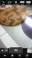 1000万画素を超えるカメラを搭載するスマートフォンが多い中、107SHのカメラは、有効画素数が約490万画素のCMOS(AF対応)である。端末サイズ同様に画素数もコンパクトなのだが、ハイビジョン動画もしっかり撮影できる。ボディに適度な厚みがあるため、安定したグリップが可能で、さらに「ON速起動」により、ロック中の「ウェルカムシート」から約0.4秒でカメラを起動できる。自分撮りも可能な30万画素のインカメラも備えており、その携帯性と機能の点で使いやすい仕上がりになっている。