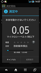 測定方法は「常時測定」と「しっかり測定」の2種類が用意されており、「クイック起動キー」で簡単に計測できる。「常時測定」は、設定をONにしておけば自動的に計測され、ウェルカムシートのインフォエリアや、ウィジェットでいつでも確認できる。「しっかり測定」は、特定の場所で時間をかけて測るもので、「クイック起動キー」を長押しすると測定開始画面が起動し、後は画面に従って操作するだけで簡単に測定でき、測定履歴をいつでも確認できるというのが特長だ。一定線量を超えると、音、バイブ、インフォメーションで通知する機能ももつ。専用機器ではないため調査目的には使えないが、漠然と不安を抱えて暮らすよりも、状況が可視化されたほうがいいという方には、有効な機能といえそうだ。ただし、得られた結果の扱いは慎重に行いたい。